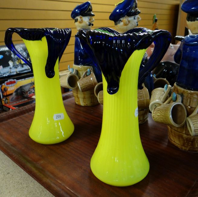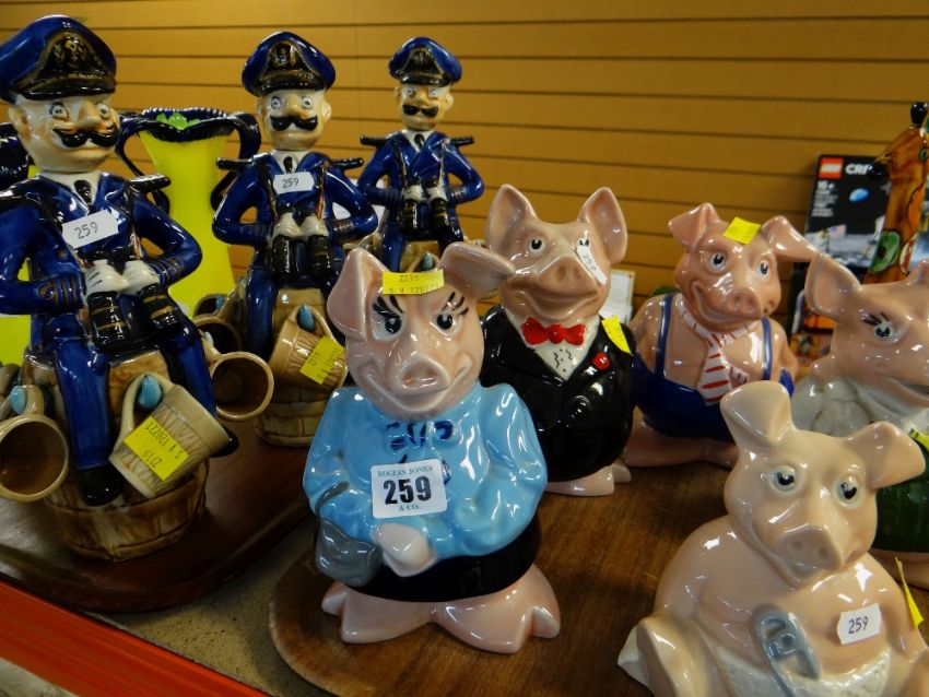 ASSORTED COLLECTABLE CERAMICS & GLASS including five Wade porcelain piggy banks, three novelty nautical spirit flasks and pair of yellow / blue glass vases