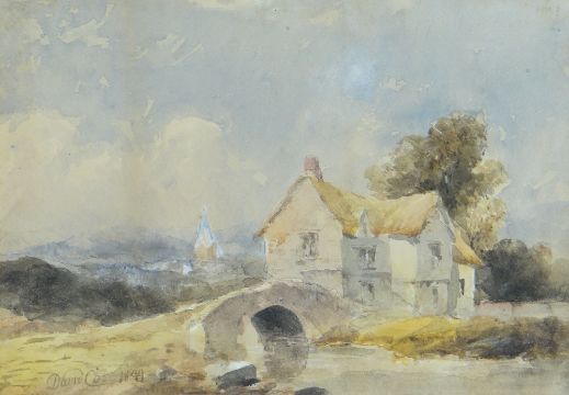 DAVID COX JR watercolour - thatched dwelling and bridge, distant church steeple, signed and dated 1849, 24.5 x 34.5cms