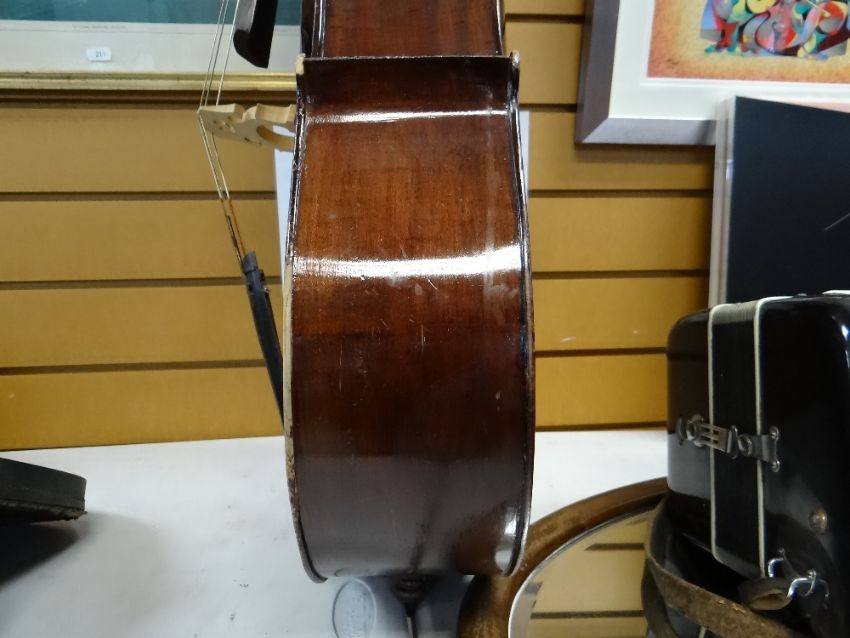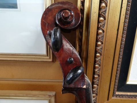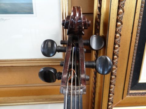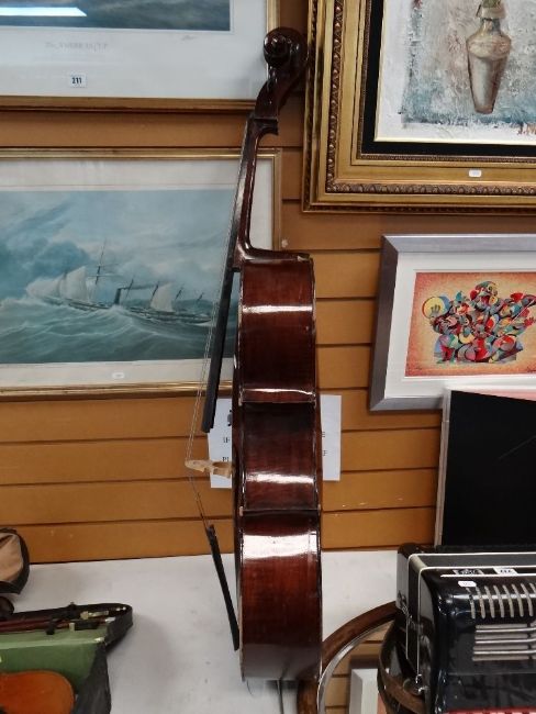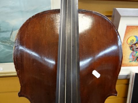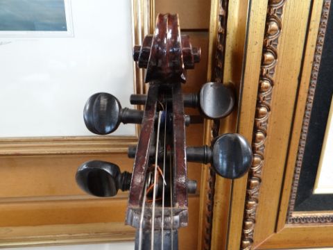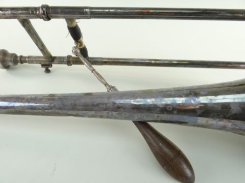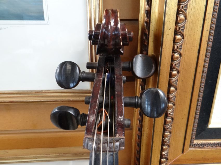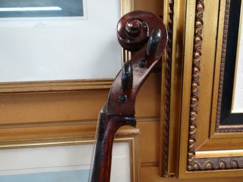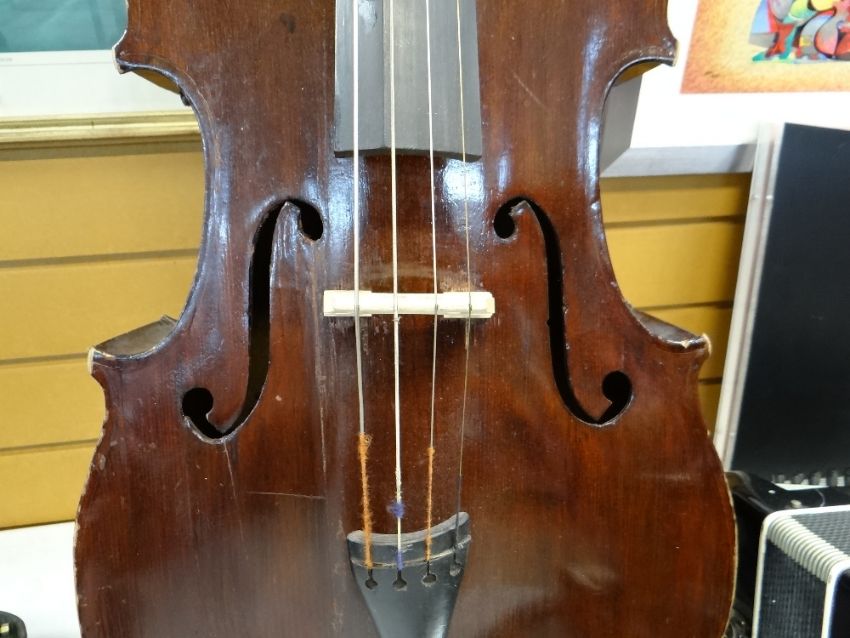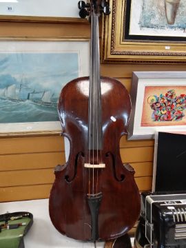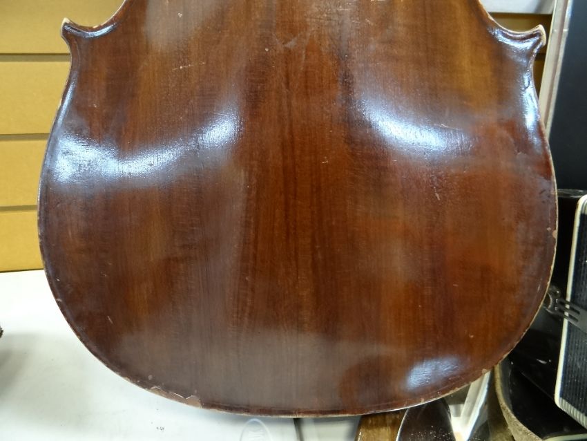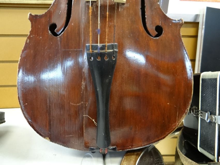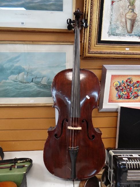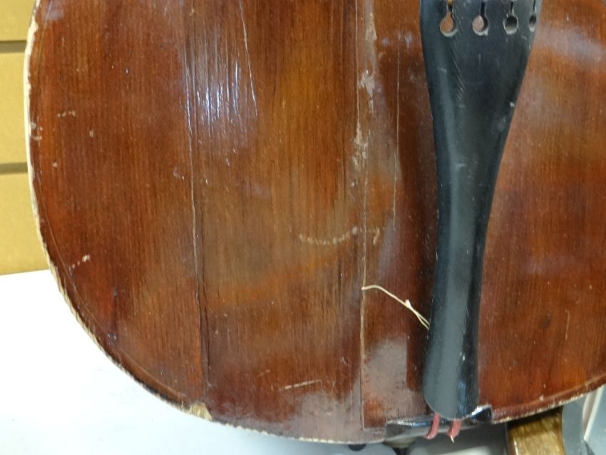 THREE ORCHESTRAL INSTRUMENTS, including a students violin, students cello and Higham silvered trombone (3) Condition Report: violin with restuck finger board, worn varnish, damaged string, scratches, dents etc. Cello with splits and repairs, chips, wear to varnish all over, trombone, repaired slide, worn, back with metal clamp.There are no labels on the celloThere is a bow included with the celloThe model name on the trombone is improved class and under the Manchester England is the number 44391