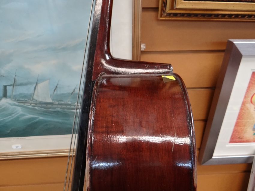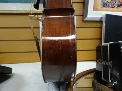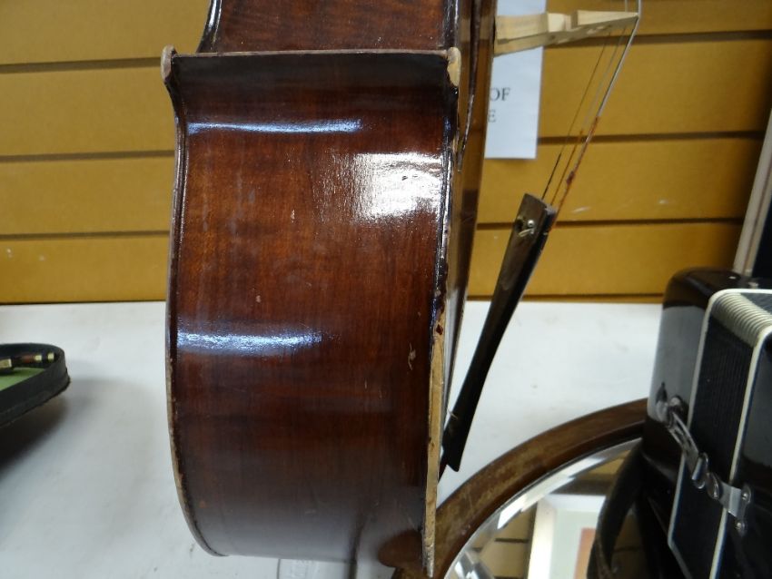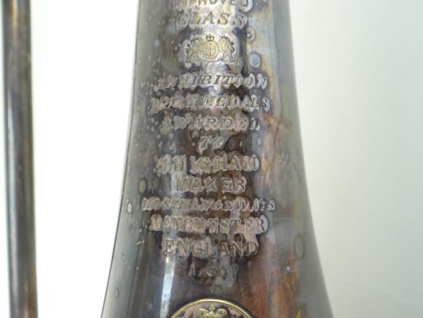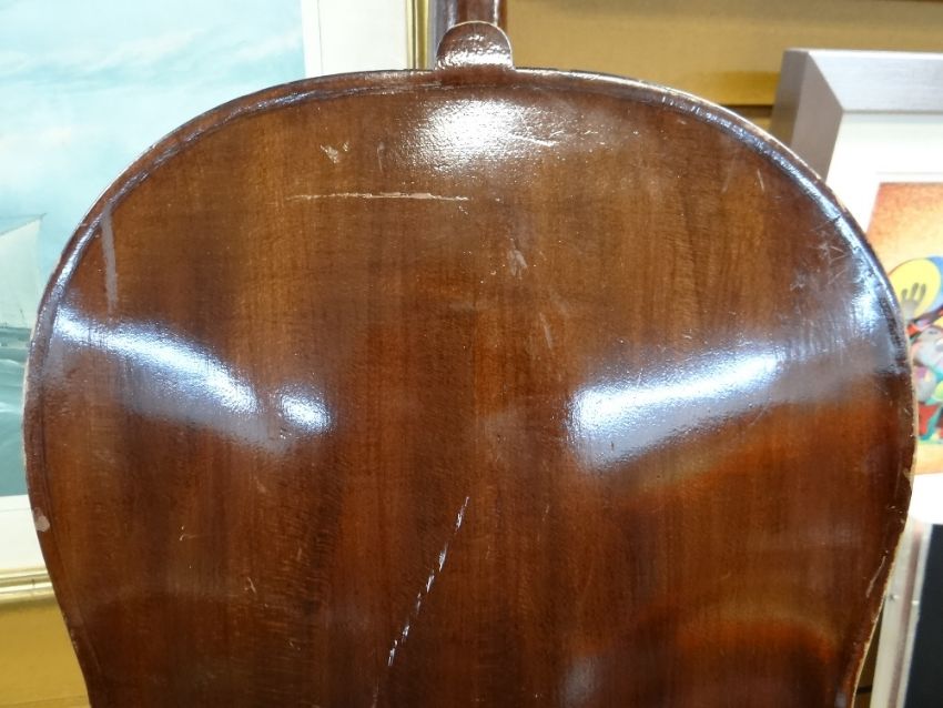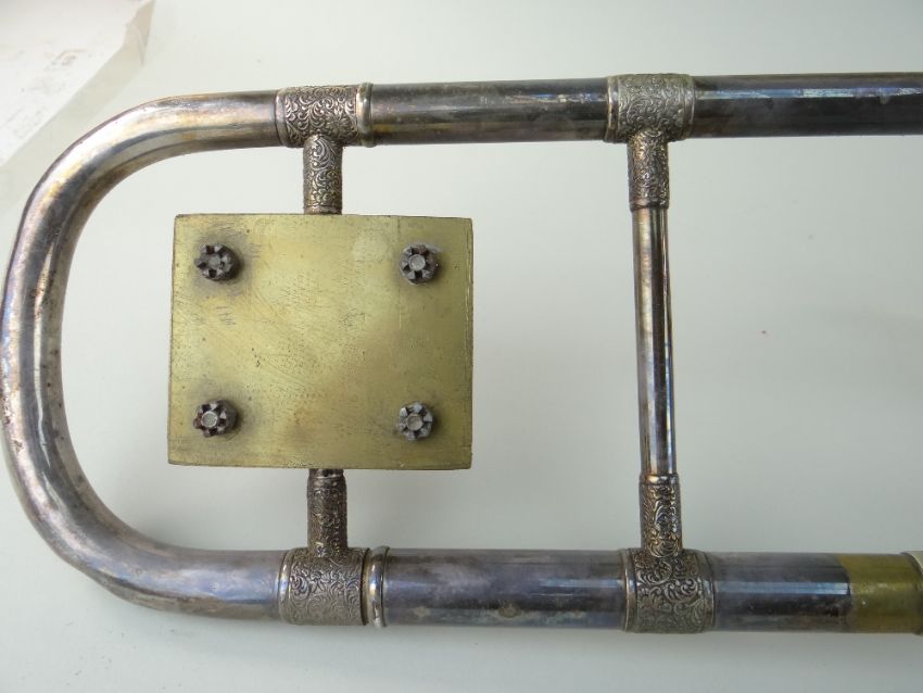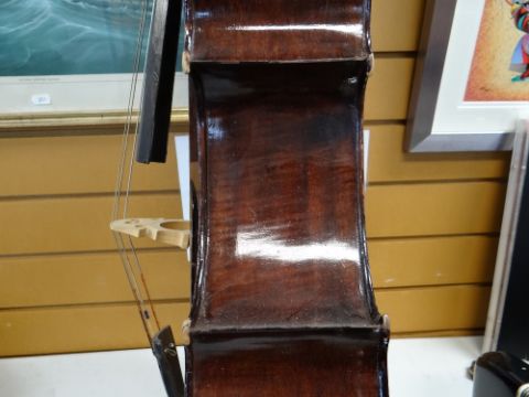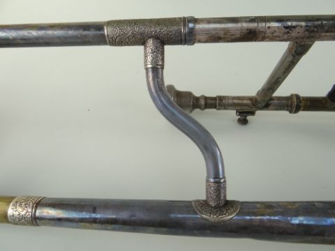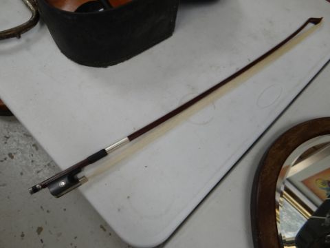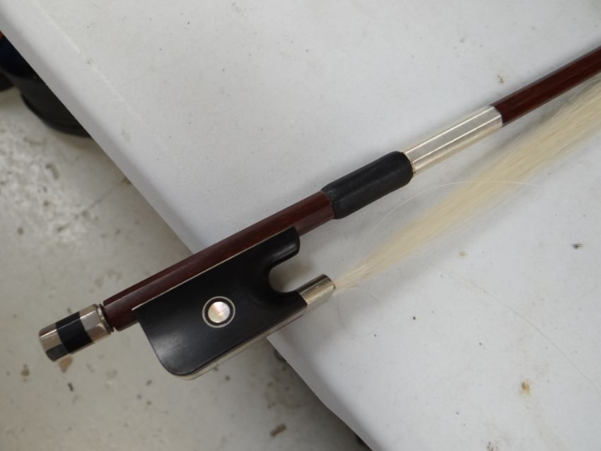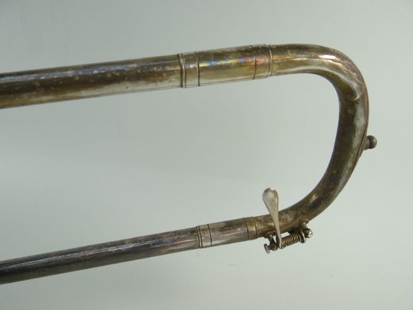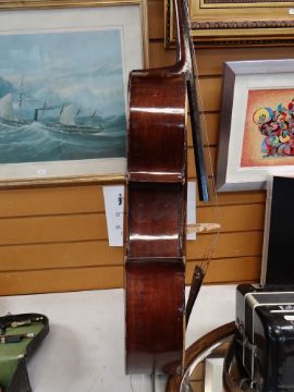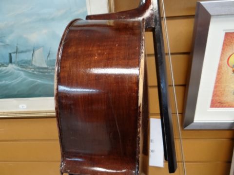 THREE ORCHESTRAL INSTRUMENTS, including a students violin, students cello and Higham silvered trombone (3) Condition Report: violin with restuck finger board, worn varnish, damaged string, scratches, dents etc. Cello with splits and repairs, chips, wear to varnish all over, trombone, repaired slide, worn, back with metal clamp.There are no labels on the celloThere is a bow included with the celloThe model name on the trombone is improved class and under the Manchester England is the number 44391