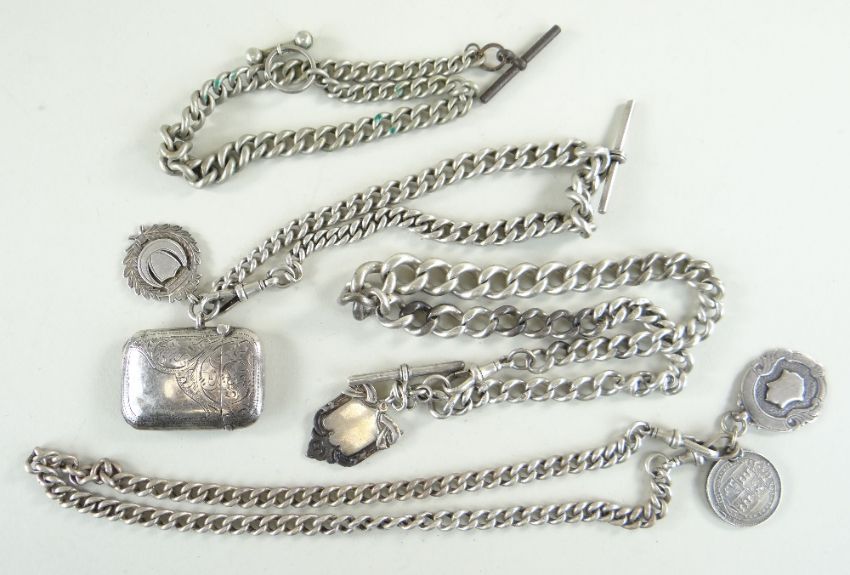 THREE SILVER CURB LINK ALBERT CHAINS, with swivel hooks, fobs, a vesta case and a 1887 shilling, tot. wt. 7 t.oz., an other in white metal (4)