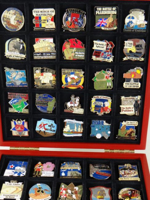 DANBURY MINT ATLAS EDITION ENAMEL PIN BADGES, comprising set of fifty 'British Victory' battle pins with cards, a set of sixteen 'Kings & Queens of England' and sixteen 'Medieval Earls' shield pins, all boxed, two with slip cases (3)