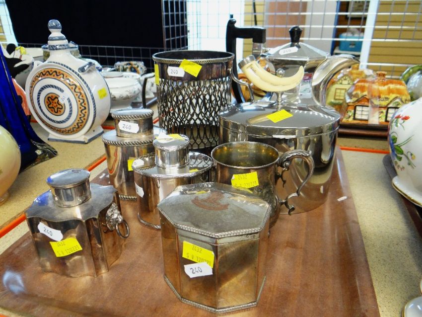 ASSORTED ELECTROPLATED WARES including three tea canisters, christening mug, biscuit box, coffee pot ETC