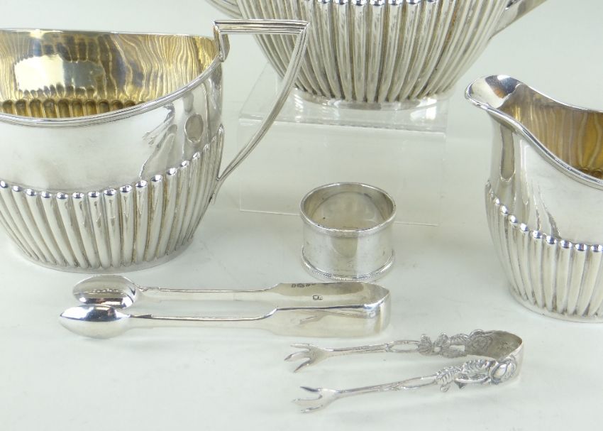 Condition Report: inscription and hallmarks slightly rubbed, Victorian sugar nips slightly bent, napkin ring superficial scratches.