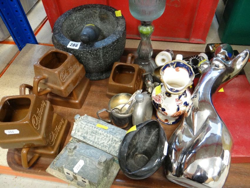 ASSORTED ORNAMENTS including Cadbury chocolate novelty mugs, large granite mortar and pestle ETC