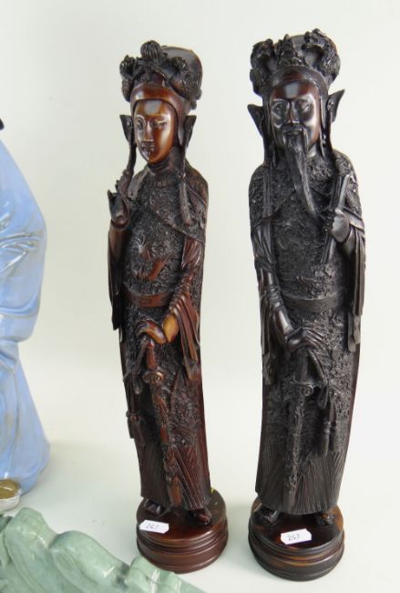 ASSORTED CHINESE ORNAMENTS including pair of glazed pottery figures of manchu warriors, two resin figures of courtiers and carved green hardstone sword