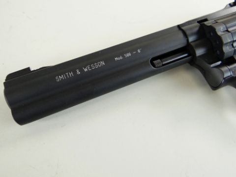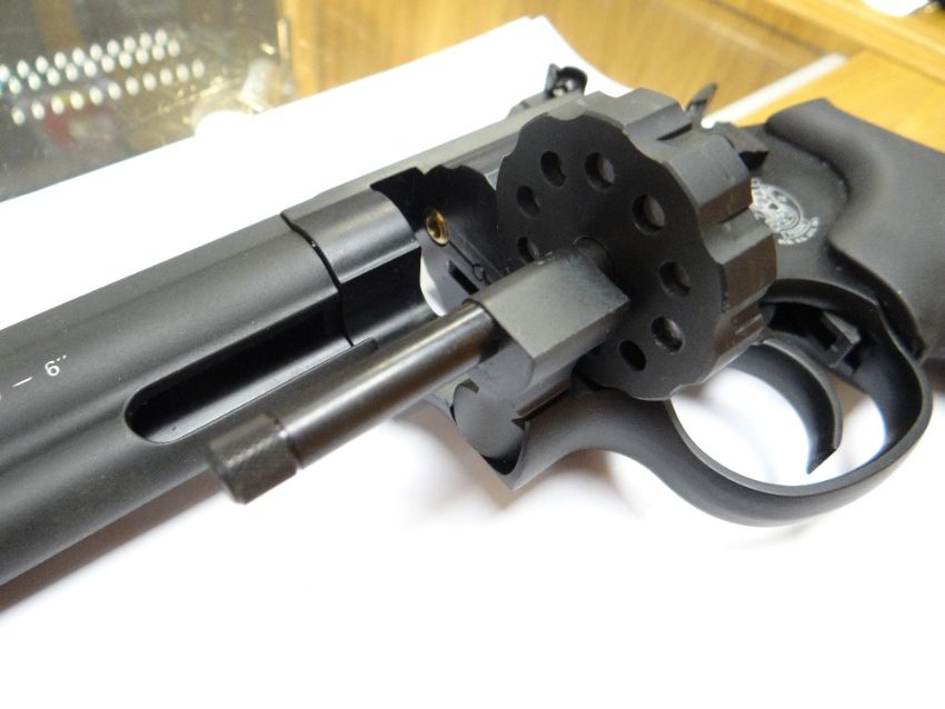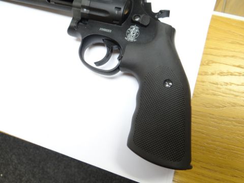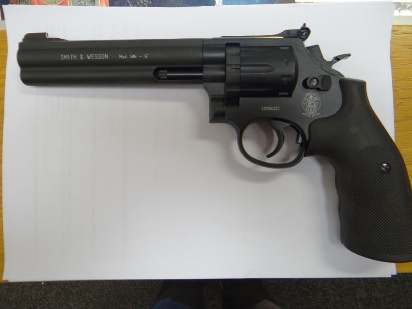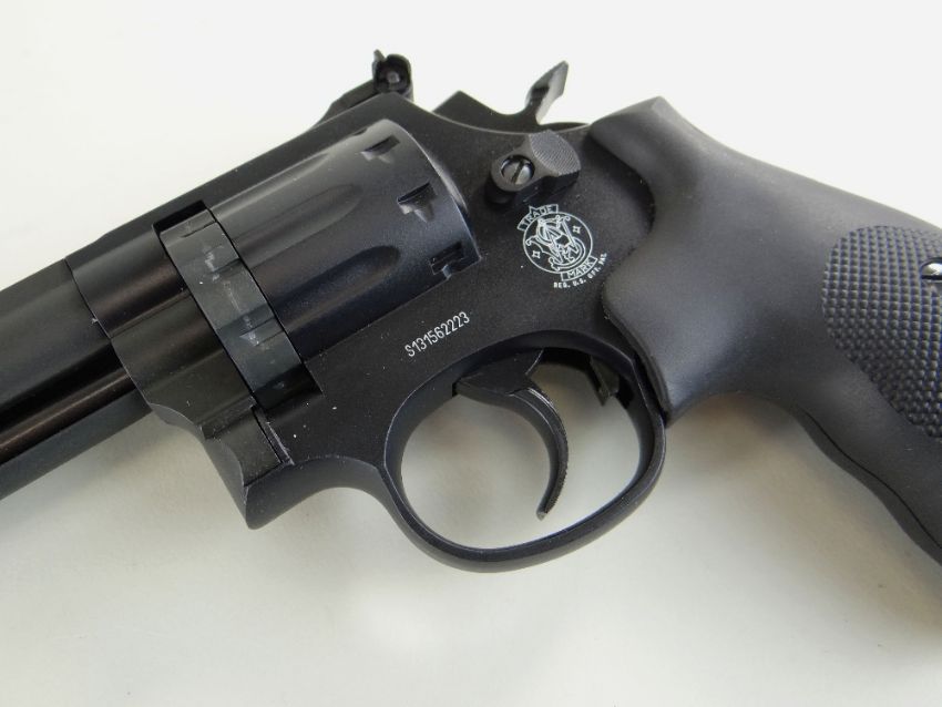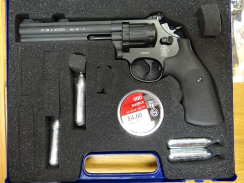 SMITH & WESSON 586 AIR PISTOL REVOLVER .177 caliber, no 513*****, with tin of pellets and CO2 canisters, boxed with leaflet