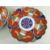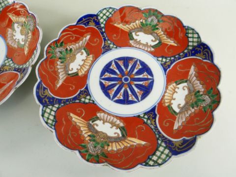 PAIR OF JAPANESE GOSEI IMARI KIKUGATA DISHES, with panels of stylised animal and plant motifs, 34cms diam. (2)