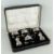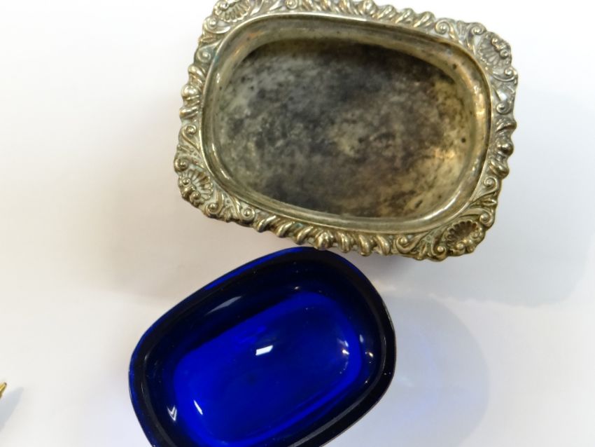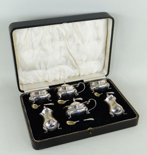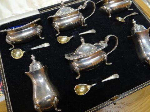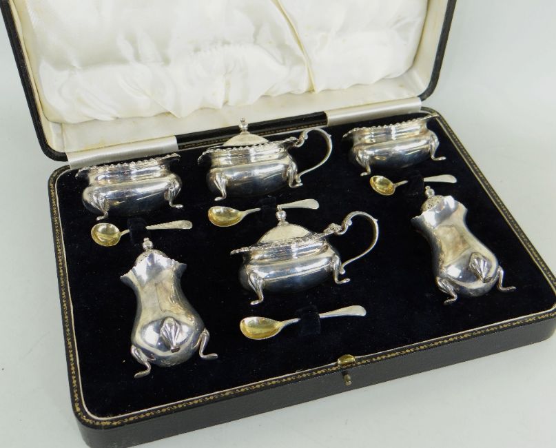 BOXED EDWARD VIII SILVER SIX-PIECE CRUET SET, Birmingham 1938, comprising pair of mustard, pair of salts and pair of pepperettes, with four spoons, tot.wt. appr. 16.5t.oz.The blue liners are chipped
