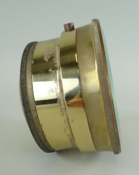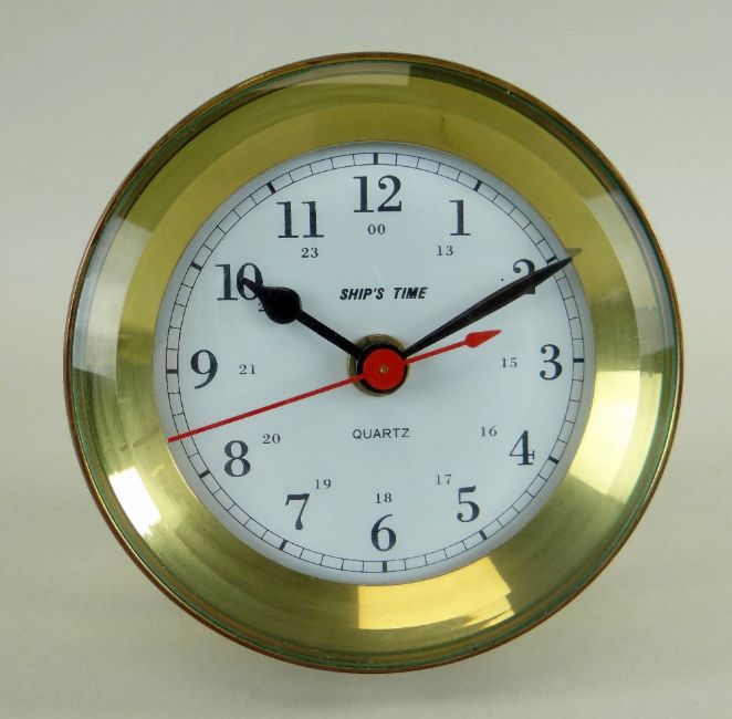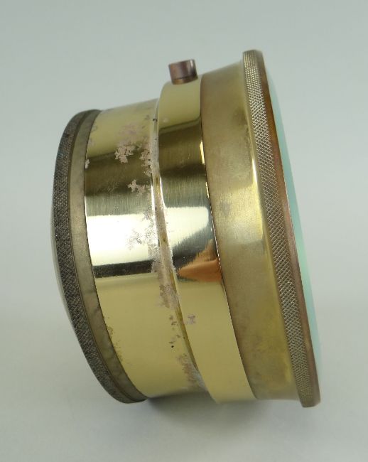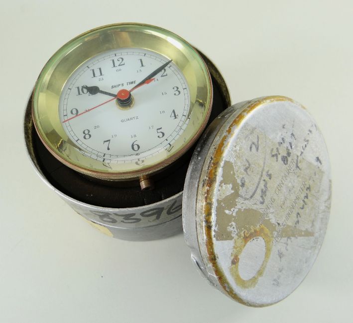 MODERN BRASS 'SHIP'S TIME' CLOCK, styled as a 4 1/2 in. marine chronometer in brass drum case with gimbal lugs, quartz movement, with metal shipping container