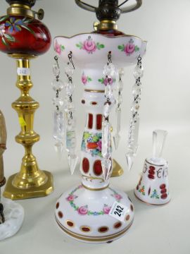 ASSORTED GLASS including Victorian-style overlaid cranberry flashed table lustre, matching table bell, Murano-style figure of a man blowing a horn and pair of oil lamps converted from candlesticks