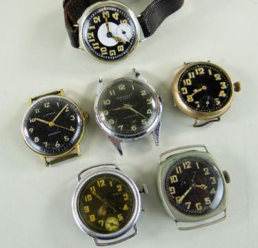SIX VINTAGE WRISTWATCHES WITH BLACK DIALS, including an 'Aircraft' watch, a 'Kienzle' watch, a trench-type watch and two others (one lacks glass) (6)