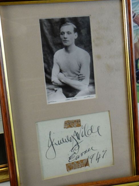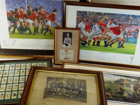 ASSORTED SPORTING MEMORABILIA and PRINTS, including framed Iink autograph of lightweight boxer Jimmy Wilde, dated 1947, mounted photograph of Blaengarw (Wednesday's) Football 1903-4, colour cricketing print after Sir R P Staples and G H Barables of 'An imaginary Cricket Match' the original in Lords, two sets of framed cigarette cards of golfers and cricketers, and two colour prints , 'The Dragons' Roar after Peter Cornwell and 'Pride of the Lions '74' after Keith Fearon with associated palyer signatures (7)