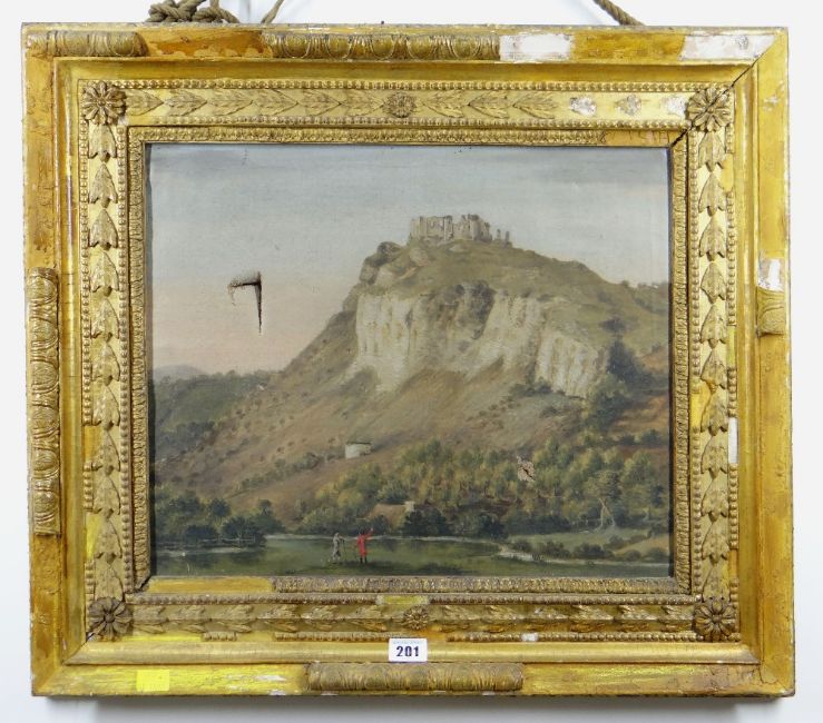 19TH CENTURY BRITISH SCHOOL oil on canvas - view of Carreg Cennan Castle with figures to the fore, 36 x 44cms