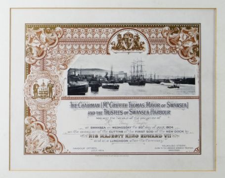 TWO HISTORIC SWANSEA DOCKS CIVIC INVITATIONS, to Messrs. Percy and Martin Player to attend "the cutting of the first sod" of the new dock and attended by King Edward VII from the Chairman and Trustees of Swansea Harbour, 20 July 1904, framed overall 37 x 79cms