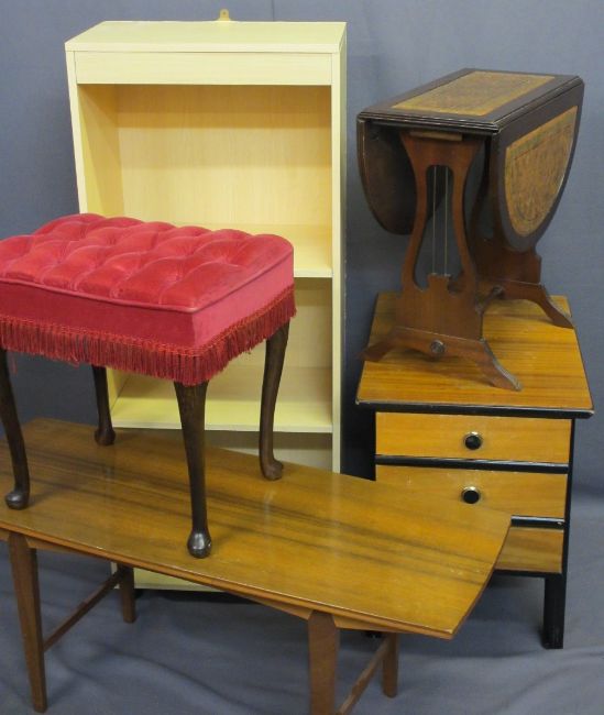 VINTAGE & MODERN FURNITURE PARCEL including a melamine open bookcase, stylish mid-century three drawer chest/table, lyre end twin-flap reproduction occasional, mid-century coffee table and a button upholstered dressing stool