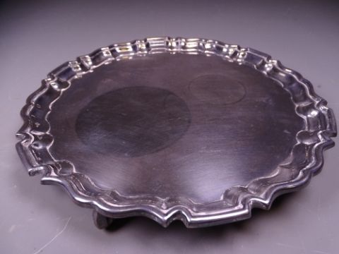 SILVER CIRCULAR CALLING CARD TRAY, Sheffield 1975, maker Mappin & Webb, 20cms diameter with raised wavy edge on three knurled feet, 11.3 troy ozs