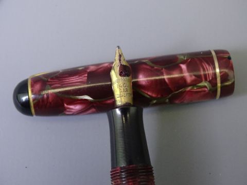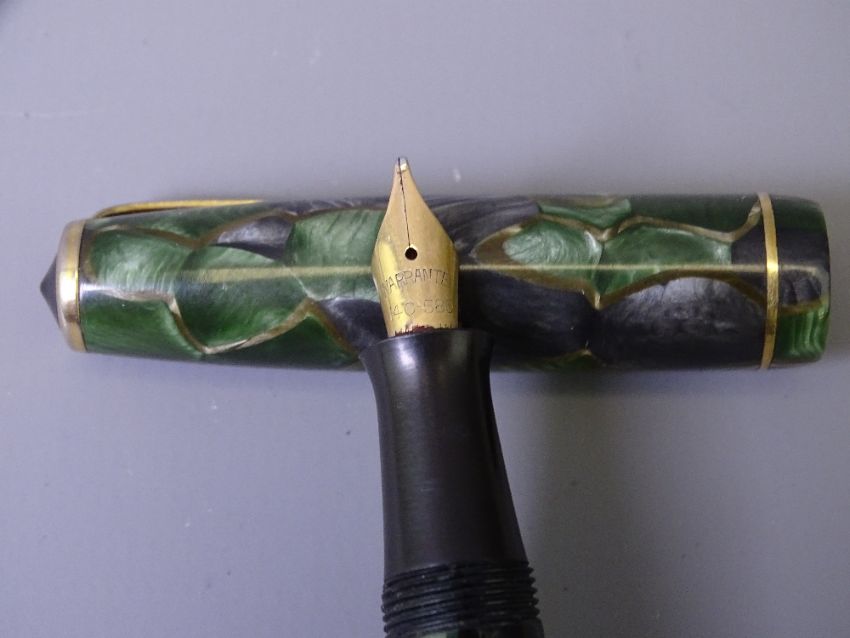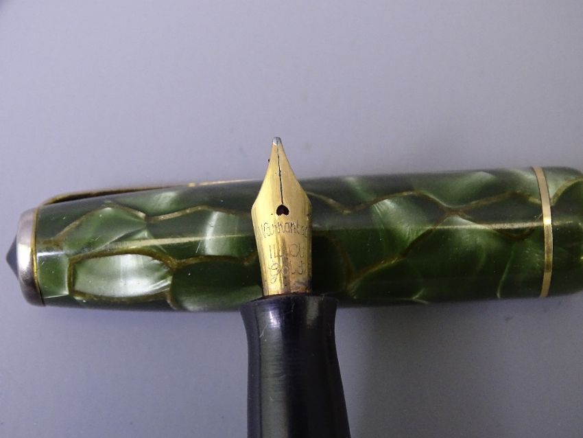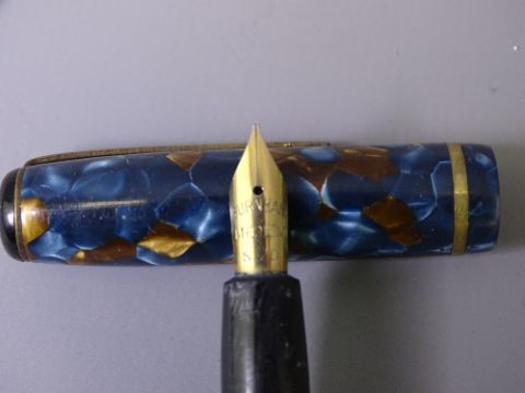 BURNHAM - Vintage (1950s) Blue and Gold Marble Burnham No.44 fountain pen with gold plated Burnham nib and Blue and Gold Marble Burnham pencil. In a Burnham box but not a set and 3 Vintage (1950s-early 60s) Boots Chatsworth fountain pens manufactured by Burnham: 1 Green and Grey with Gold veining; 1 Burgundy Marble and Gold veining; 1 Green Marble and Gold veining. All with gold plated trim and warranted 14ct gold nibs
