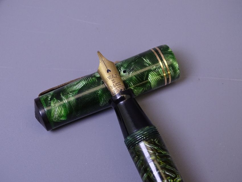 SWAN MABIE TODD - Vintage (late 1930s) Green/Silver crosshatch patterned Swan Mabie Todd Visofil VT 340/76 fountain pen with gold plated trim and original Swan 14ct gold No.3 nib