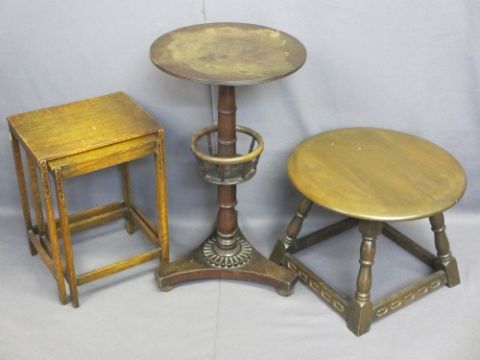 REGENCY TRI-FORM BASE OCCASIONAL TABLE with crows nest detail, 73cms H, 41cms D, a nest of three (A/F) and a circular top coffee table, 39cms H, 51cms D