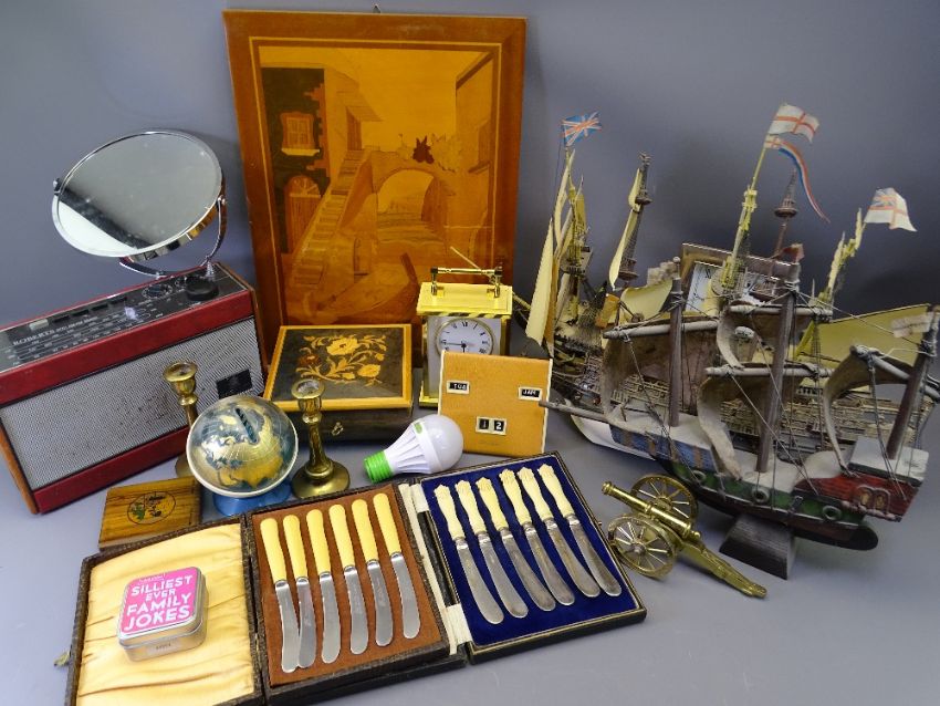 MODERN SILVER FRAME MANTEL CLOCK, Roberts radio, model ships, Angelus brass carriage clock and other interesting collectables