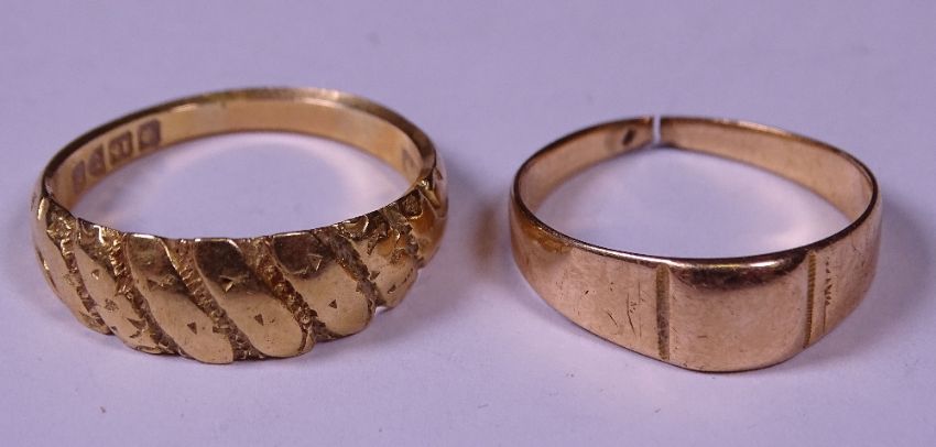 18CT GOLD VINTAGE RINGS (2) including a wide banded example, Chester hallmarked, the other having a cut shank, 9.1grms gross, the wide banded ring size U