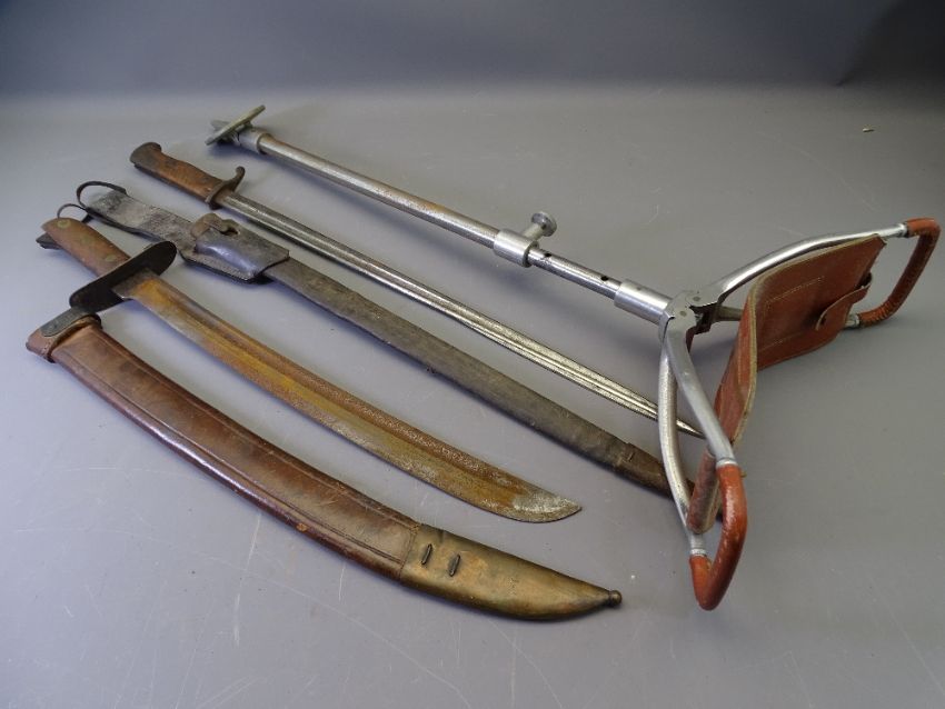 WAR TIME BAYONET IN SHEATH, curve bladed knife stamped 'Hembrug' in leather scabod and a folding shooting stick