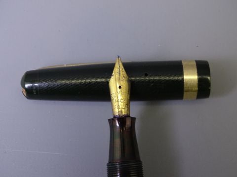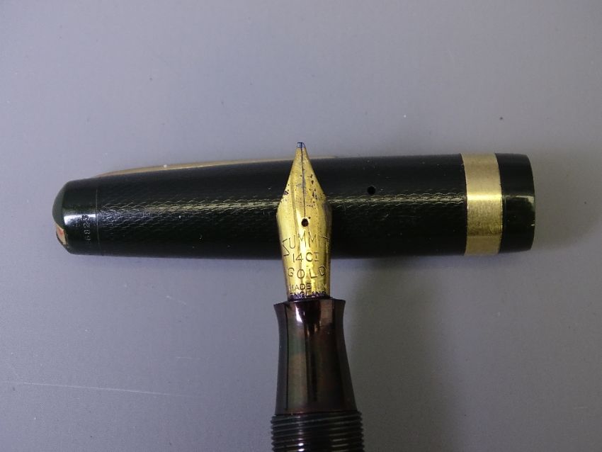 SUMMIT - two Vintage (1930s-40s) Summit fountain pens: 1.) Blue Marble S.75 fountain pen marked over three lines on barrel: SUMMIT / LONDON UNBREAKABLE LIVERPOOL / CURZONS LTD. With gold plated trim, Art Deco style clip and 14ct gold Summit nib; 2.) Black chased celluloid fountain pen with metal trim and Warranted 14ct gold nib, both lever fill, a Vintage (1940s) Black Summit S. 175 MK 3 fountain pen with gold plated trim, double jewelled and 14ct gold Summit nib, lever fill and a Vintage (1948 - 1953) Chased Dark Green Summit S. 185 fountain pen with gold plated trim with 14ct gold Summit nib, lever fill