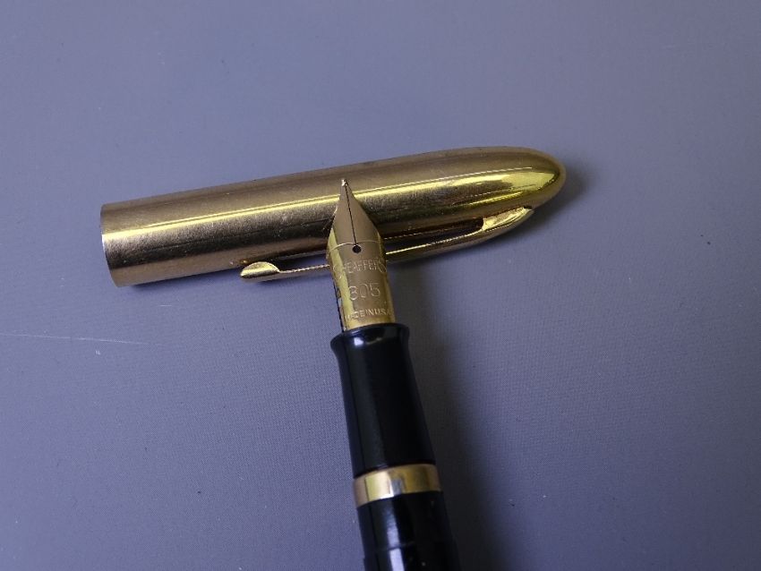 SHEAFFER - Two vintage Sheaffer cartridge fountain pens: 1.) 1960s-70s Gold Black Tulle Lady Sheaffer VIII Skripsert fountain pen with Stylpoint-like nib, black detailing very worn 2.) late 1950s-60s Black School 305 fountain pen with gold coloured cap and open nib, in a worn Lady Sheaffer box and Vintage (1960s-70s) 12ct Gold Filled Sheaffer Imperial White Dot ballpoint pen with "Grapes and Leaves" etched design, in Sheaffer box