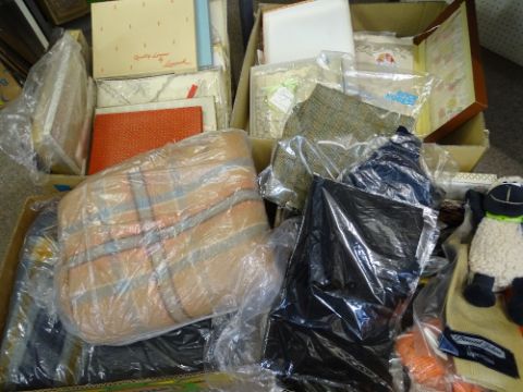 BOXED HOUSEHOLD LINEN, LADY'S SCARFS, woollen throws and other household goods (within 4 boxes)