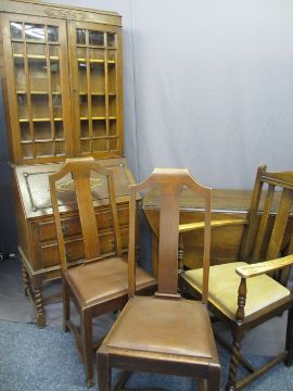 BOOKCASE BUREAU, 195cms H, 77cms W, 45cms D, gateleg table on castors, 77cms H, 50cms W, 50cms D closed along with a barley twist leg armchair and two vinyl seat dining chairs