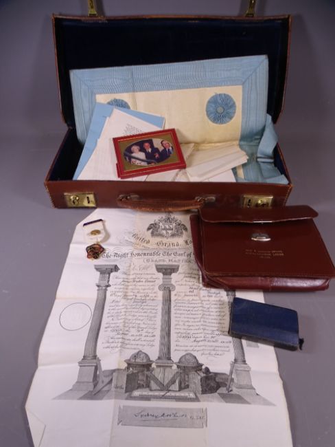VINTAGE LEATHER CASE CONTAINING MASONIC REGALIA & EPHEMERA ETC