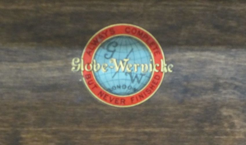 GLOBE-WERNICKE OAK THREE SECTION BOOKCASE with lower single drawer section and top cover, the lift-up fronts leaded glazed, 114cms H, 86.5cms W, 28cms max D
