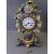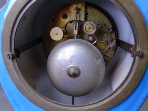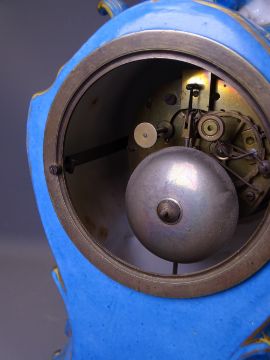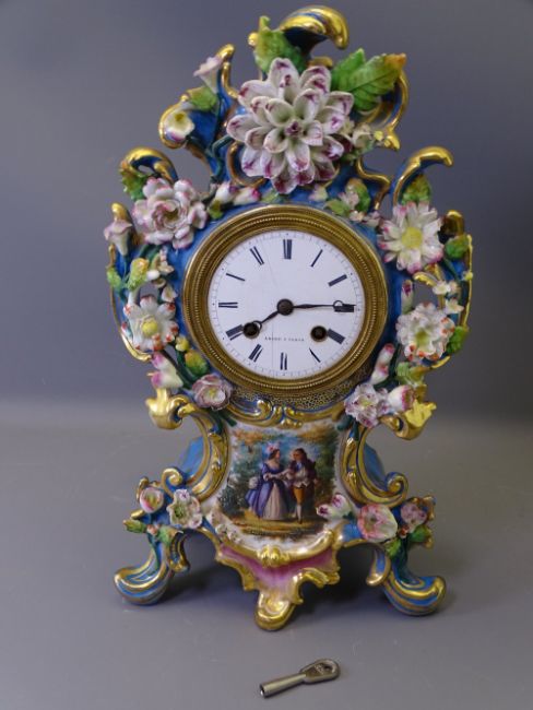 FRENCH PORCELAIN MANTEL CLOCK, blue and gilt with floral encrusted Rococo design with front panel depicting a courting couple in a garden setting, white enamel dial set with Roman numerals, marked 'Andre A Paris' before a key wind pendulum driven bell strike brass movement (key included, some chips and losses, dial cracked), 36cms H, 22cms W