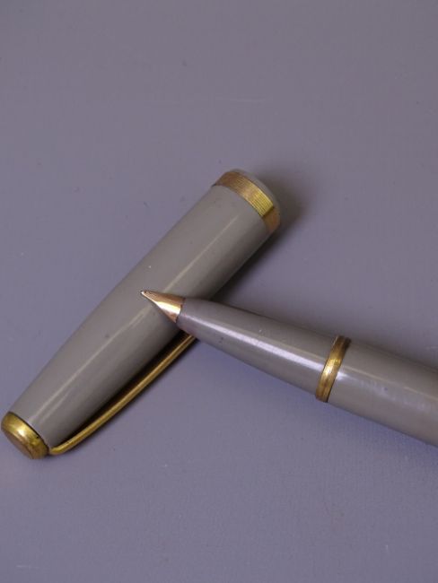 MENTMORE - Vintage (late 1940s) Grey Mentmore Diploma fountain pen with gold plated trim and original 14ct gold hooded nib, button fill and Vintage (late 1940s) Red Mentmore Diploma fountain pen with gold plated trim (some wear to clutch ring) and original 14ct gold hooded nib, button fill, slight discolouration to section