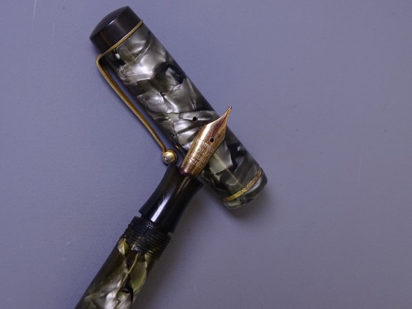 MENTMORE - Vintage (1930s) Brown and Black Marble Mentmore Auto-Flow fountain pen with gold plated trim and Mentmore 14ct gold nib, button fill and a Vintage (1940s) Grey/Green Marble Mentmore Auto-Flow fountain pen with gold plated trim and Mentmore 14ct gold nib, lever fill.