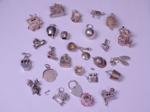 SILVER & WHITE METAL CHARMS approximately 25 in various designs including opening examples, 2.46 troy ozs
