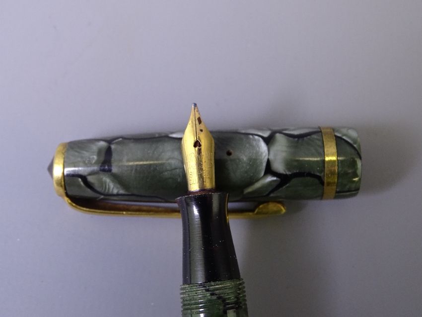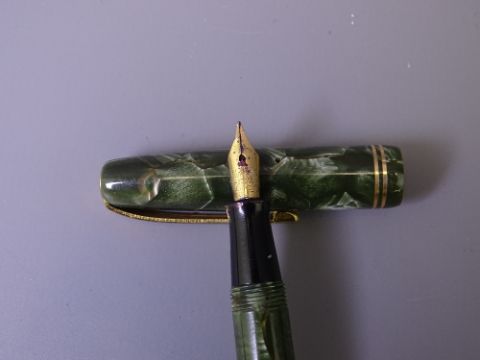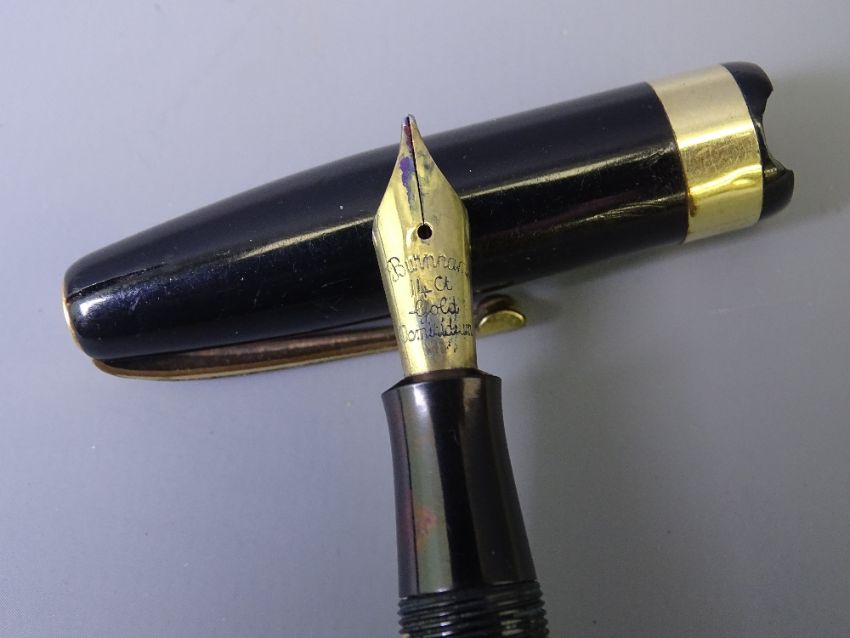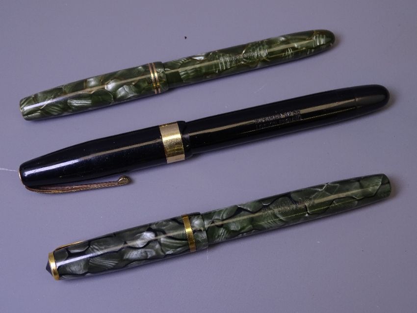 BURNHAM - Vintage (late 1940s) Black Burnham No.65 fountain pen with gold plated trim - wide cap band - and pocket clip stamped 'Burnham' with 'B' logo to cap stud. Button filler. Barrel imprint 'Burnham No 65 London England.' 14ct Gold nib stamped 'Burnham 14ct gold Osmirideum.', Vintage (early 1950s) Green Marble with Black veining Burnham No.51 fountain pen with gold plated trim and 14ct gold Burnham nib. Lever fill and Vintage (1950s) Green Marble with Brown veining Burnham No.54 fountain pen with gold plated trim and 14ct gold Burnham nib, lever fill