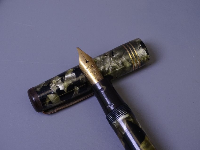 SWAN MABIE TODD - Vintage (1930s) Pearl Grey and Black Marble Swan Mabie Todd No 4 Leverless fountain pen with gold plated trim, inlaid G/F Swan in crown and original Eternal 14ct gold nib (No 4)