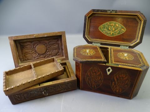 SHERATON STYLE INLAID GEORGIAN TEA CADDY and a Chinese carved hardwood box with dragon detail