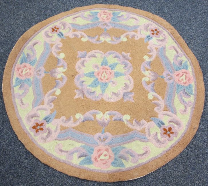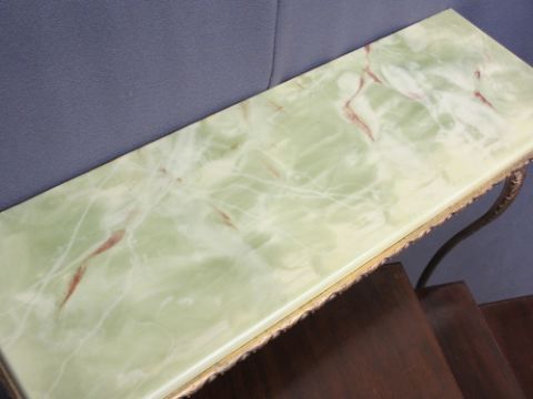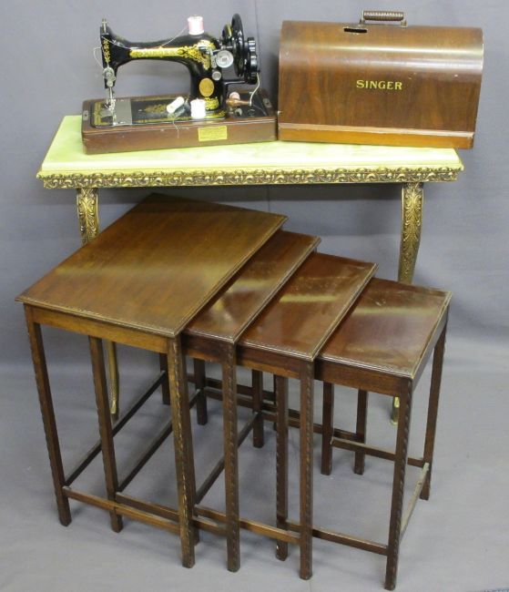 WARING & GILLOW VINTAGE OAK TABLE QUARTETO, onyx effect and gilt brass console table and a hand crank sewing machine in case by Singer, various measurements and a floral circular rug, 120cms D