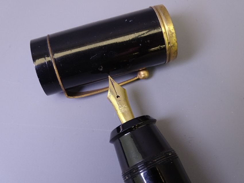 JAPANESE JUMBO - Two vintage (c1930s-1950s) Black Japanese Jumbo Eyedropper filler fountain pens with shut-off valve at end of barrel, both flat topped, 1 pen with gold coloured steel nib marked "OK Foreign"; other - with vestiges of painted design - with steel nib marked "OK. Made in Japan",13.5 cms long and 2.5cms diameter