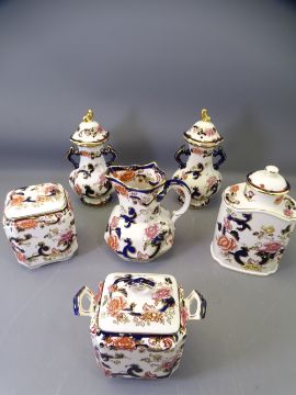 MASONS MANDALAY, six pieces including a pair of twin handled lidded vases, hexagonal jug ETC