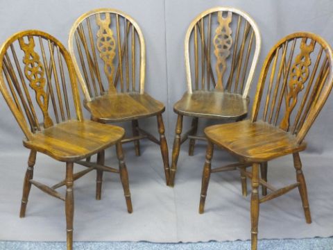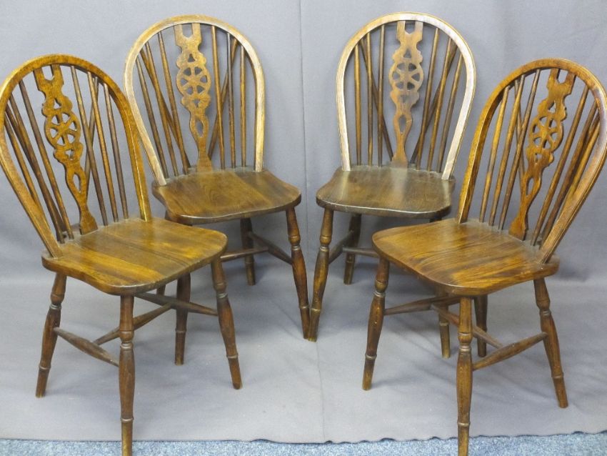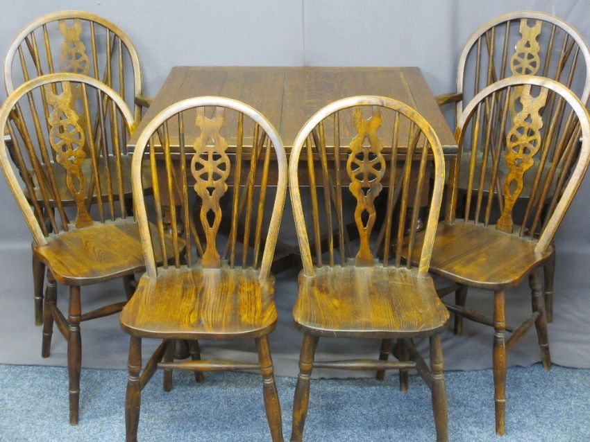 OAK DRAWER LEAF TABLE on twist supports, 75cms H, 92cms W, 92cms D closed and six wheelback chairs (4 + 2)