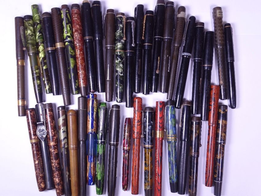 VINTANGE FOUNTAIN PENS (39), all having 14ct gold nibs with a swan metal pocket clip, names to the pens include National Security, The Grenville Harrods, Parker, Watermans, Epoc, Popular Prince, Unique, Conway Stewart, Summit, New Bond Easiflow, Mentmore, Swan Mabie Todd and others (sold as spares or repairs), general use and conditions overall, possibly matched caps to some, one or two have missing clips or cap covers, thread gone to the brown marbled Stevens 76, cap damaged to the Grenville brown ribbed with gilt collar, ditto the Burnham Golden Guinea with green and blue marbling (no further condition report for these pens is available)