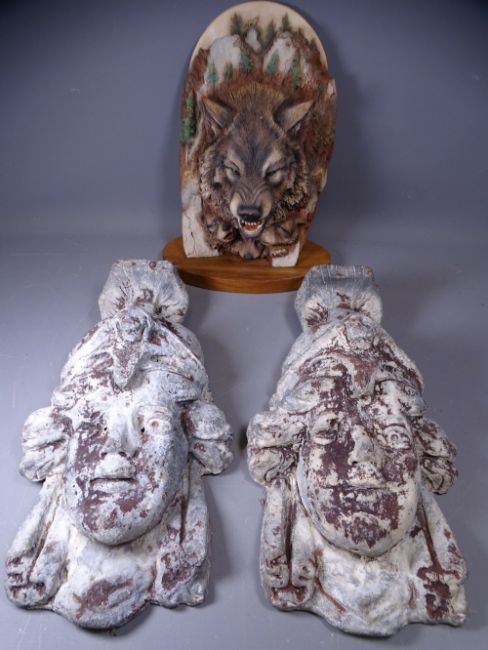 LEAD WALL PLAQUES, a pair depicting Greek military heads, 44cms H, and a Canadian wolf model by Paul R Carris ??? entitled 'Maternal Instinct'