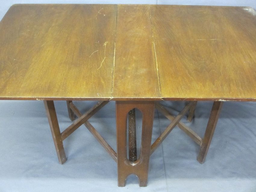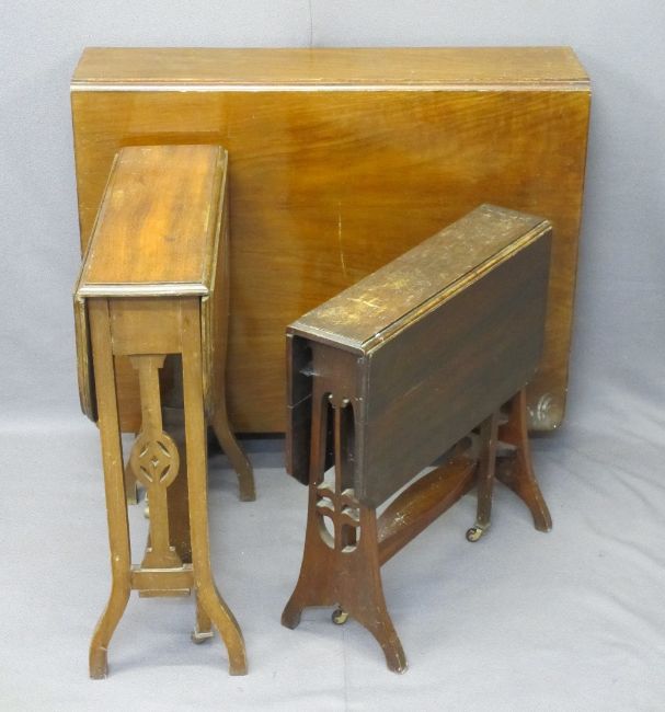 MID-CENTURY DROP LEAF TABLE, 74cms H, 83cms W, 23cms D closed, (144cms open), two Sutherland tables with Arts & Crafts detail