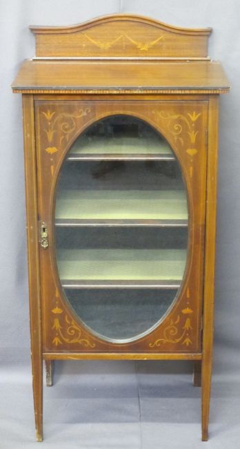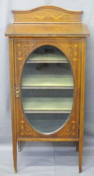 SHEET MUSIC MAHOGANY INLAID CABINET, single door, oval glazed with four interior shelves, 114cms H, 54cms W, 35cms D