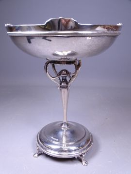 STYLISED PEDESTAL SILVER DISH, Sheffield 1920, maker Roberts & Belk, 16.8 troy ozs, 18cms D dished top on an open scroll work and tapering segmented column with circular base raised on four feet, 22.5cms H