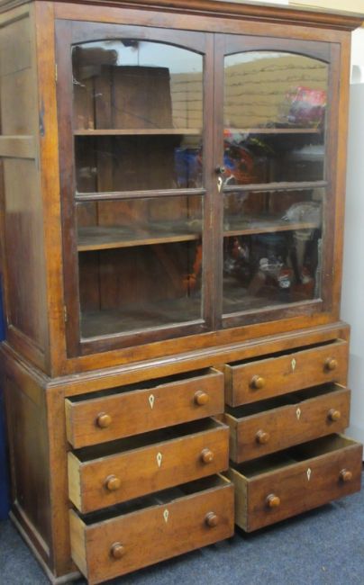 VICTORIAN PRESS CUPBOARD - replacement glazed twin upper doors over six base drawers, 193cms H, 129cms W, 50cms D
